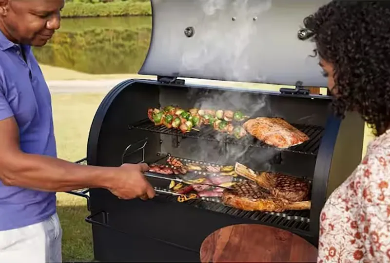 The Oklahoma Joe’s Marshal is a center box smoker that offers 1200 sq. in. of total cooking space. This offers a heavy-duty construction that will last for years.