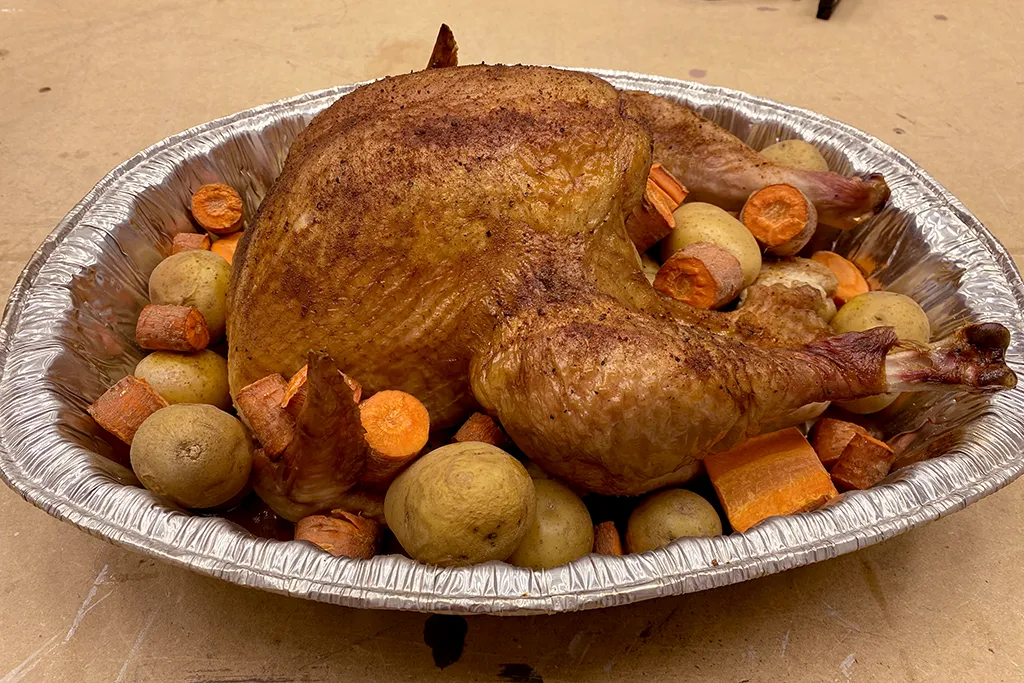 Our bird cooked quicker than expected. The potatoes and veggies we added had barely any time to cook or soak up those flavors. We all agreed that cook times are unpredictable so it’s best to just put those items with your turkey into the pellet grill in the beginning if you want those. If gravy excites you more than just allow the drippings to collect at the bottom of your pan.