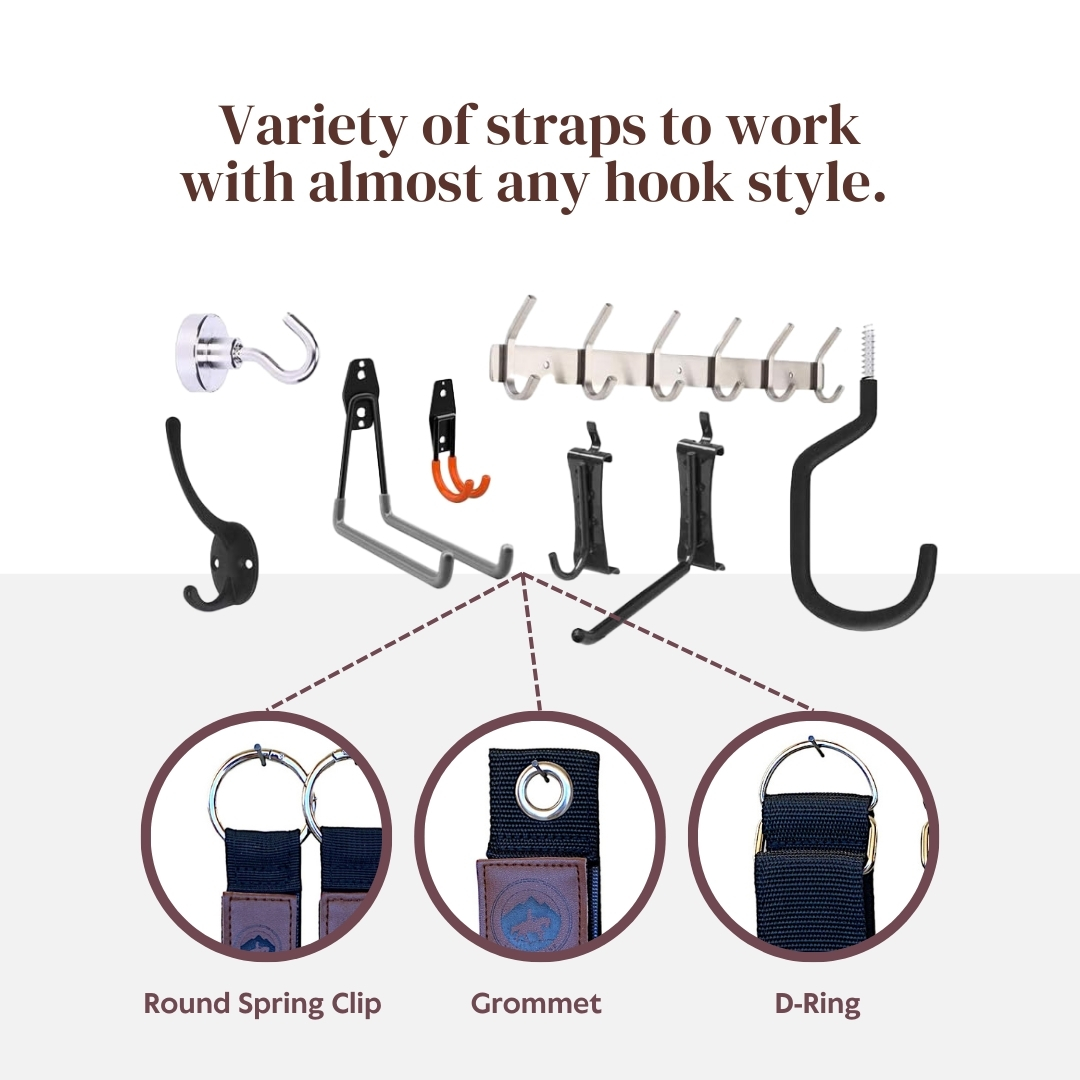 The hook styles are grommet, D-ring, and round spring clip to fit most hook types. The straps range from 1-2 inches wide and 9-25 inches long. Each strap is made of a thick, durable nylon blend for strength and longevity, allowing you to use these straps again and again.
