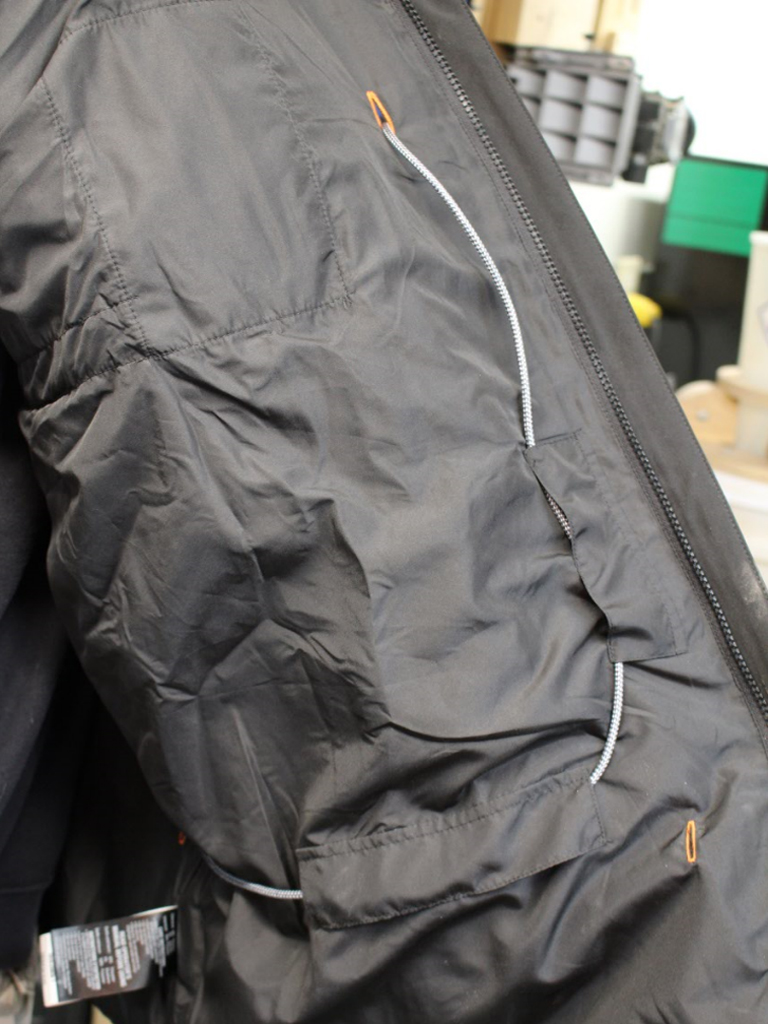 There is a cable run on the inside of the jacket that allows you to connect a USB cord from the battery pack up to the breast pocket of the jacket. If you decide to run this cable, you will be able to charge your phone as you wear the jacket. This will, of course, lower the amount of battery life you have to run the heating elements.