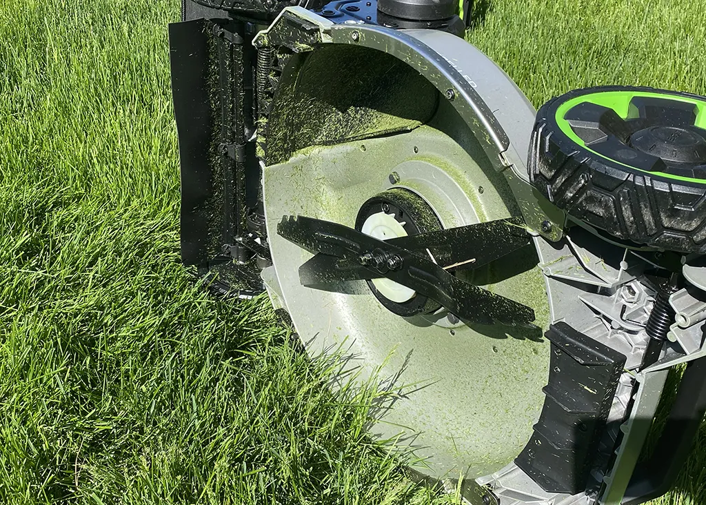 The 2024 EGO Lawn Mower has a Select Cut™ Multi-Blade Cutting System. This mower has a two-blade cutting system with upper deck blades and interchangeable lower blades. The two blades gives it twice the cutting power. The two blade work with the motor and battery to provide up to 11.1 ft-lbs of cutting torque and achieve blade speeds all the way up to 3,350 RPM.