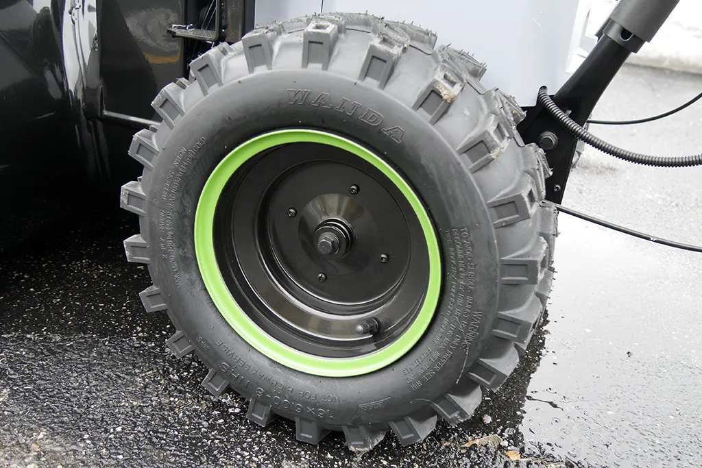 In addition to the high-tech features, EGO added four LED headlights to the front, and equipped this blower with large 16 in. x 5 in. anti-traction snow tires. People tend to be concerned that electric snow blowers are too lightweight for harsh conditions. The IPX4-rated exterior ensures the EGO 28 in. 2-stage snow blower can stand up to harsh winter conditions.